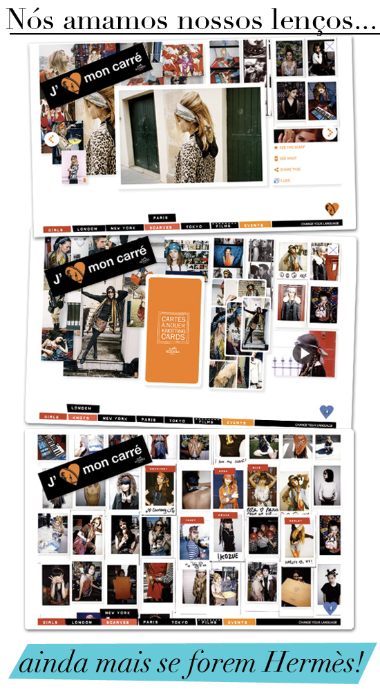 Lá nós encontramos fotos e mais fotos de várias meninas residentes de Londres, Nova York, Paris e Tokyo que inventam 1001 maneiras de usar um legítimo lenço da marca.