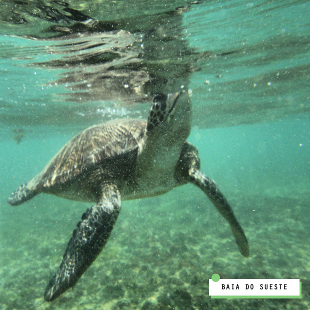Falando da praia do Sueste, lá é incrível para quem quer ver a vida marinha. Vi arraia, tubarão e um grupo com umas dez tartarugas gigantes. O local de mergulho é bem raso - cerca de 60 cm de profundidade - e cheio de corais que não podem ser pisados, por isso, o uso de coletes salva vidas é obrigatório.