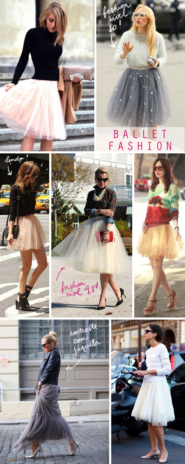 E no post, eu acho LINDO em teoria. Serio. A foto mais embaixo, na direita, eu me imagino usando. Mas na vida real… comprei uma vez algo parecido e nunca usei, acabei doando. E muito doce, muito menininha! Tem que ter um super estilo e atitude, e ainda assim acho que tem poucos lugares que usaria sem causar estranheza. No final das contas prefiro usar essa saia quando estou no ballet mesmo, literalmente! rsrs… e so para conhecimento, nas aulas de ballet nao usamos saias assim, em uma aula normal usa uma saia transpassada bem levinha, transparente, ou mesmo sem saia ou de shorts - o professor precisa enxergar bem os movimentos! Essa saia e uma saia de figurino e e chamada tutu romantico e normalmente aparece nas primeiros atos de um ballet. Um dos que eu acho mais lindos e o da Coppelia, vejam no google. Ele chama tutu romantico em constraste aquele que chamamos (informalmente) de tutu prato que, bem, lembra um prato e aparece mais nos segundos atos.