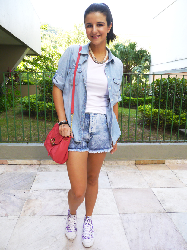 Confesso que minha criatividade não estava das melhores nesse dia, fiz a mistura mais fácil do mundo: camiseta branca, short jeans de cintura alta e camisa jeans. A bolsa com uma cor diferente foi apenas para dar uma “interessância” maior na produção. Não tinha como não mostrar esse e os outros tênis da coleção: