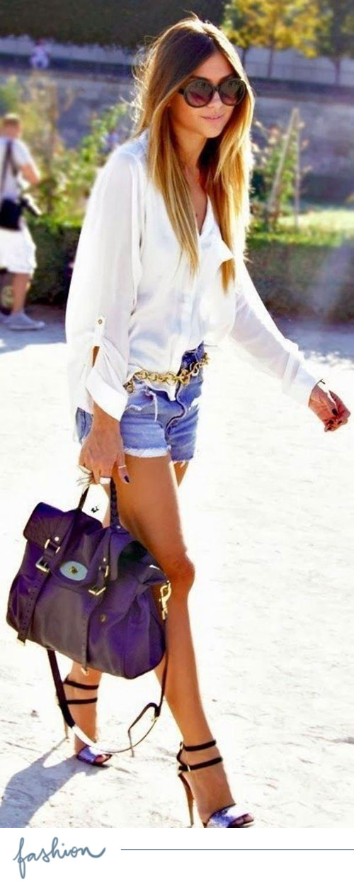 Outro look com short jeans completamente diferente daquele mais confortável que eu mostrei ali em cima. Esse é fashion sem necessariamente ser ousado. O salto ajuda, mas acho que a cor da bolsa (e a forma de segurá-la) também ajudam nessa impressão!