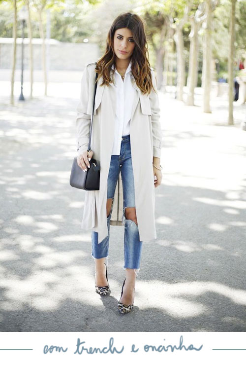 Opa, fez frio? Trench coat em cima e pronto, tá linda! Nesse caso, o sapato de oncinha foi o toque de ousadia que deu certo na medida exata. Como o verão de SP está com cara de outono, usaria ontem esse look todo!