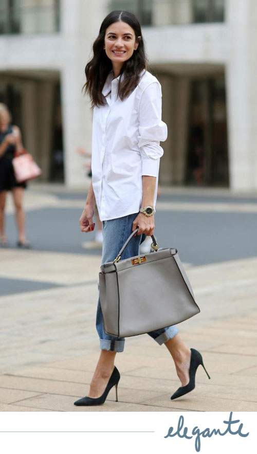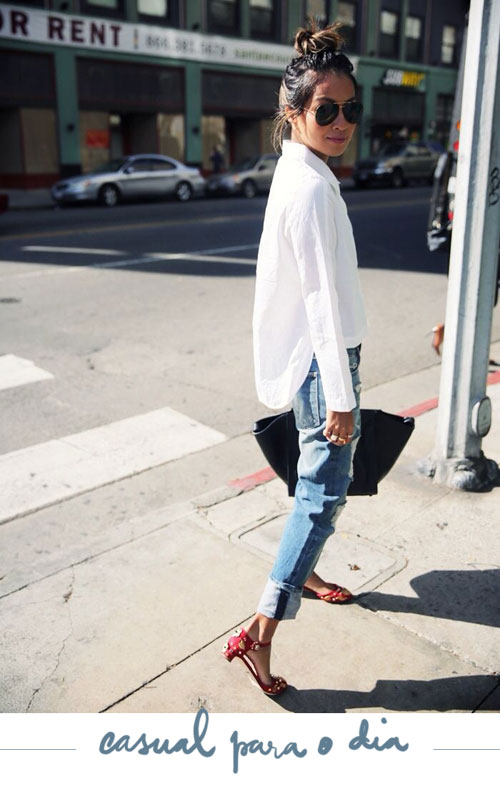 Enfim, falei tudo isso só para dizer que, pelo menos para mim, camisa branca e jeans é uma dessas combinações que podem até ser básicas mas sempre dá certo. Apesar de parecer tudo muito óbvio, eu vejo possibilidades de criar looks desde o mais basiquinho para o dia a dia até algo mais elegante para algum evento mais informal. Separei algumas ideias para ilustrar isso, olha só (prepara que lá vem ideia):