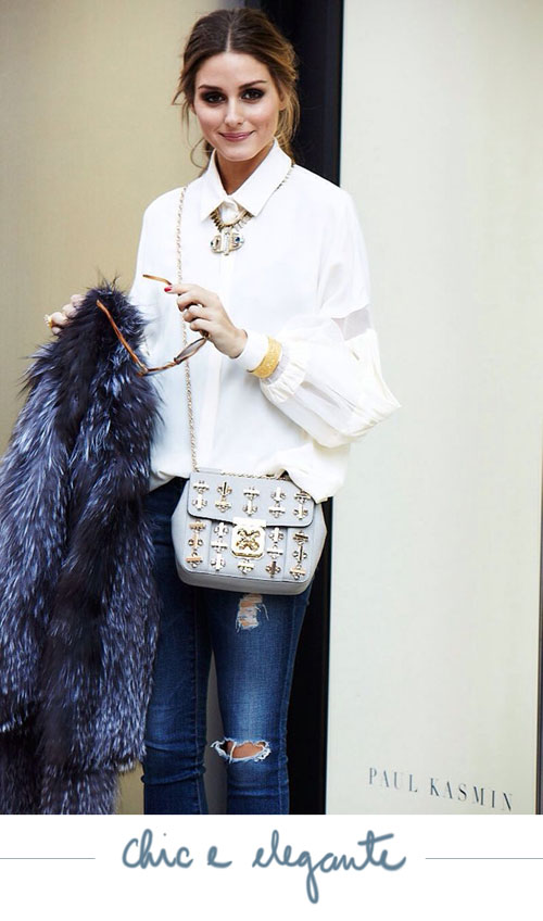 Olivia Palermo mostrando que dá para usar camisa branca e jeans e ficar chic, elegante e com cara de rica. E mostrando para a gente como os acessórios certos são essenciais para ajudar nessa empreitada (tanto que eu arrisco dizer que nem precisava do casaco de pele para dar essa impressão).