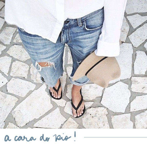 Um look que poderia ser bem invisível mas a calça jeans rasgadona trouxe a personalidade que a camisa branca pedia. Só não curti essa tira do sapato.