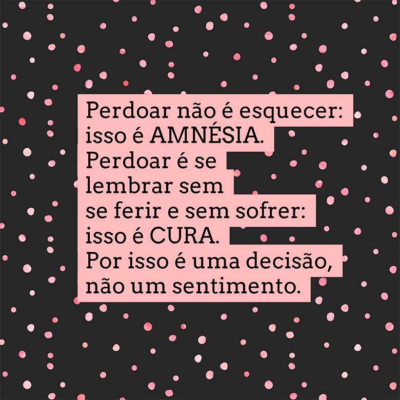 Mas vamos encarar as coisas: como muitas coisas na vida, perdoar, mesmo sendo uma decisão, é também um processo que começa depois da tomada de consciência. Quase nunca você vai decidir perdoar e isso vai vir automaticamente. Algumas pessoas farão isso de forma instintiva, outras precisarão de terapia. Mas é importante tentar, processar e chegar ao nível de entendimento onde o perdão é possível para seguirmos leves. Porque a vida é melhor sim para quem perdoa. E quem perdoa mostra que se ama ao ponto de não querer viver carregando consigo um peso grande da mágoa, que destrói a gente por dentro.