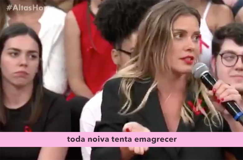“Aquele vestido de noiva….a pessoa branca, gorda, de branco….piorou tudo.” E emenda na frase “Tiago, você precisa me dar a chance de ser uma noiva gata”.