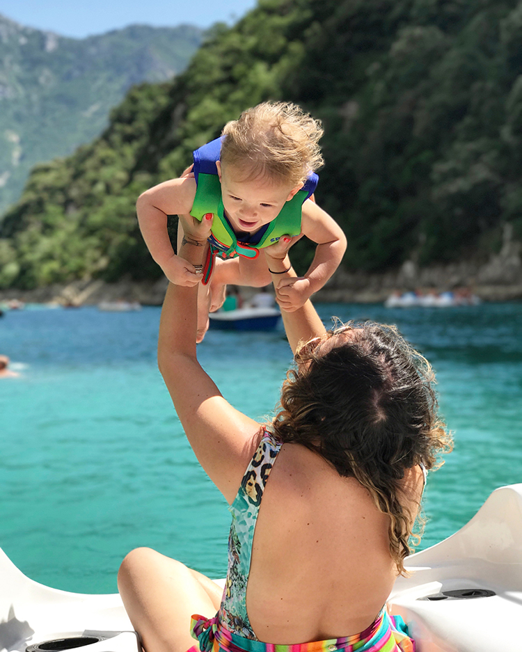 Obviamente esse pensamento foi embora no segundo que chegamos, assim como foi embora qualquer pensamento! Enquanto a gente pedalava eu só aproveitei o calor, a água deliciosa e as paisagens maravilhosas. Foi uma experiência renovadora, mesmo com um Arthur doido pela água querendo ficar toda hora no lago e exigindo da gente atenção extra. Aliás, quem estiver indo com criança pequena, sugiro pagar mais caro e usar o barco elétrico (35 euros a hora). É bem mais caro, mas a volta de pedalinho foi bem chata já que estávamos contra o vento precisando pedalar forte enquanto o Arthur tentava sair do nosso colo para chegar perto da água. No barco elétrico seria mais simples, pois enquanto um dirigia o outro poderia cuidar do Arthur sem perrengues.